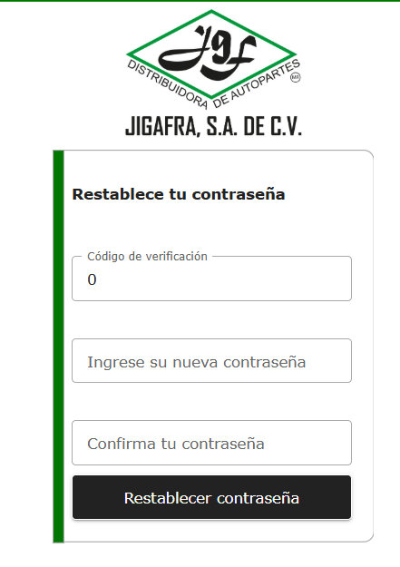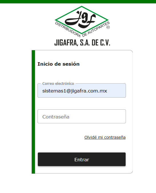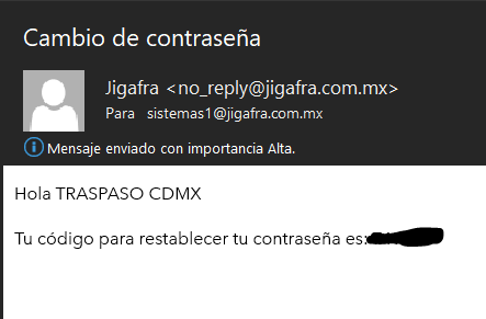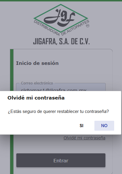 En el apartado de correo se pondrá el que esta registrado en el sistema de JIGAFRA, y para obtener la contraseña se deberá dar click en Olvidaste tu contraseña, lo cual al hacerlo nos arrojará la siguiente ventana.