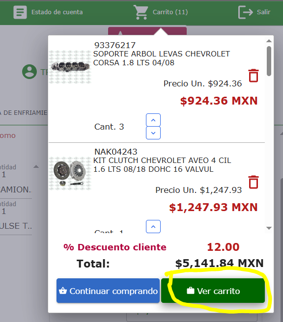 Al seleccionar ir al carrito arrojara una página con 3 apartados el primero es material pedido con stock, el segundo apartado solo mostrara información de material pedido, pero el cual no cuenta con existencia, solo es un contrl interno y en el tercer apartado muestra el total del pedido desglozando descuento y cuenta con un cuadro para agregar algunas observaciones.