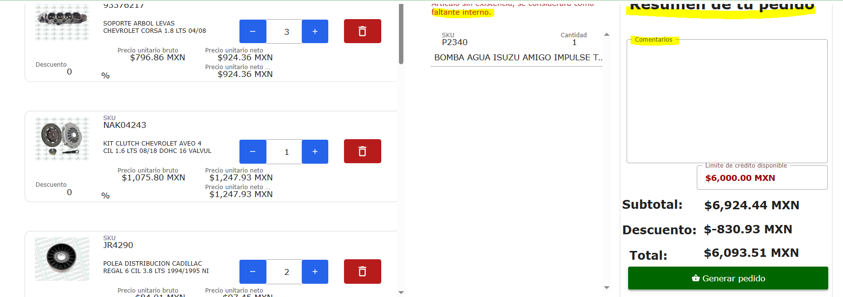 De igual forma es importante mencionar que el material agregado como faltante interno no suma al total del pedido.